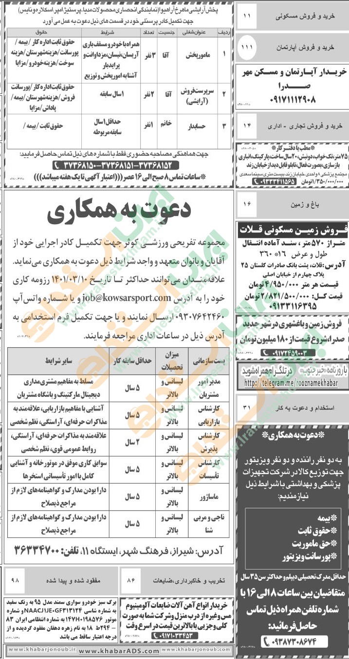 روزنامه استخدامی فارس و شهر شیراز | چهارشنبه 28 اردیبهشت 1401