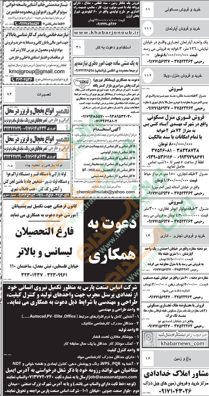 روزنامه استخدامی فارس و شهر شیراز | شنبه ۲۸ خرداد ۱۴۰۱