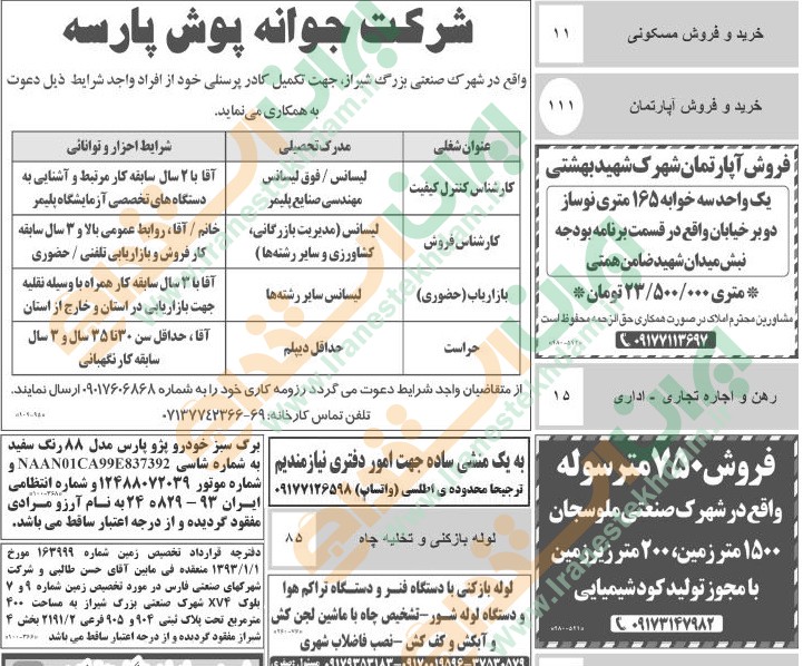 روزنامه استخدامی فارس و شهر شیراز | یکشنبه ۲۹ خرداد ۱۴۰۱