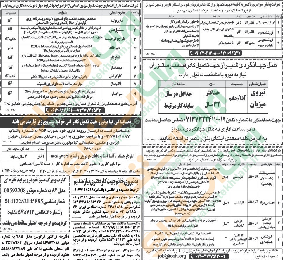 روزنامه استخدامی فارس و شهر شیراز | شنبه ۳۱ اردیبهشت ۱۴۰۱