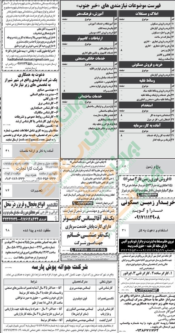 روزنامه استخدامی فارس و شهر شیراز | یکشنبه 4 اردیبهشت 1401