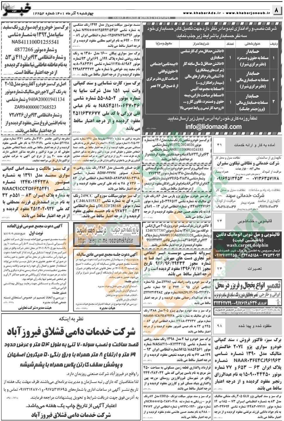 روزنامه استخدامی فارس و شهر شیراز | چهارشنبه ۹ آذر ۱۴۰۱