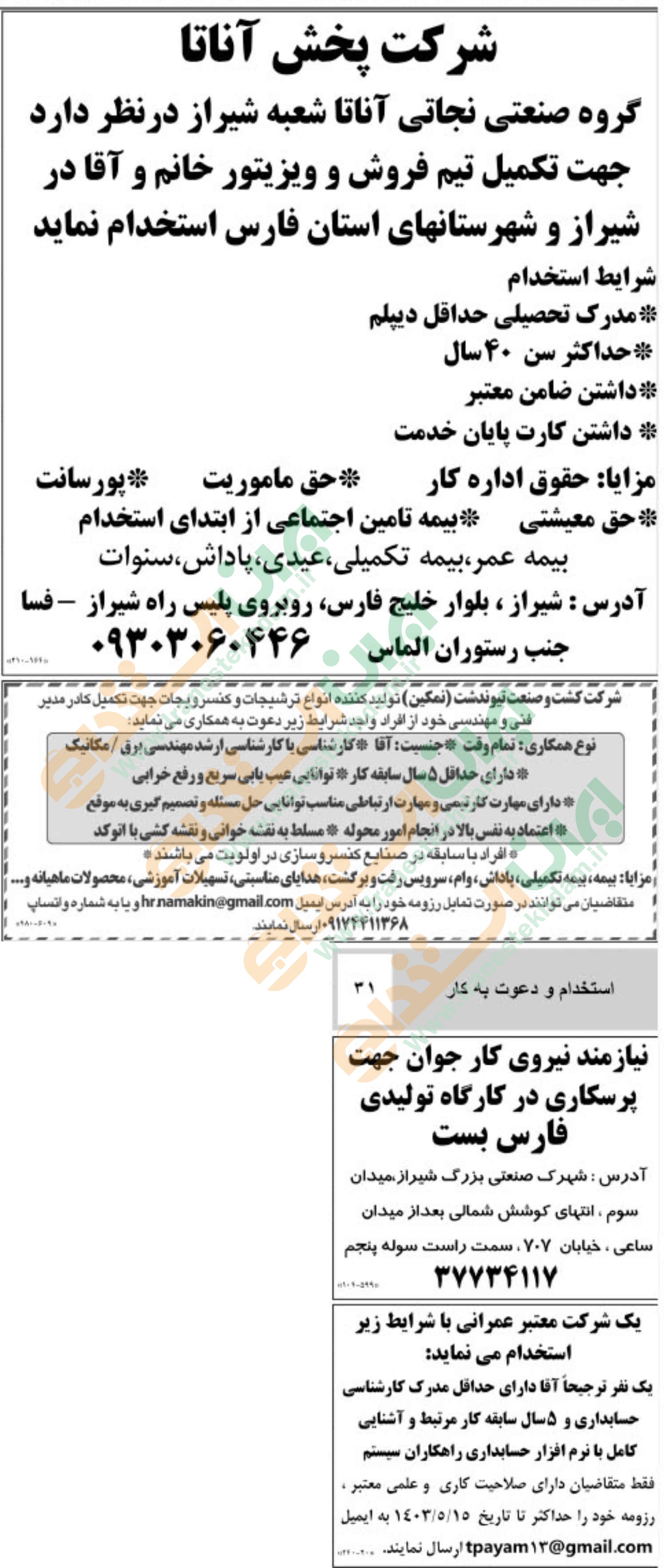 روزنامه استخدامی فارس و شهر شیراز | سه شنبه 9 مرداد 1403
