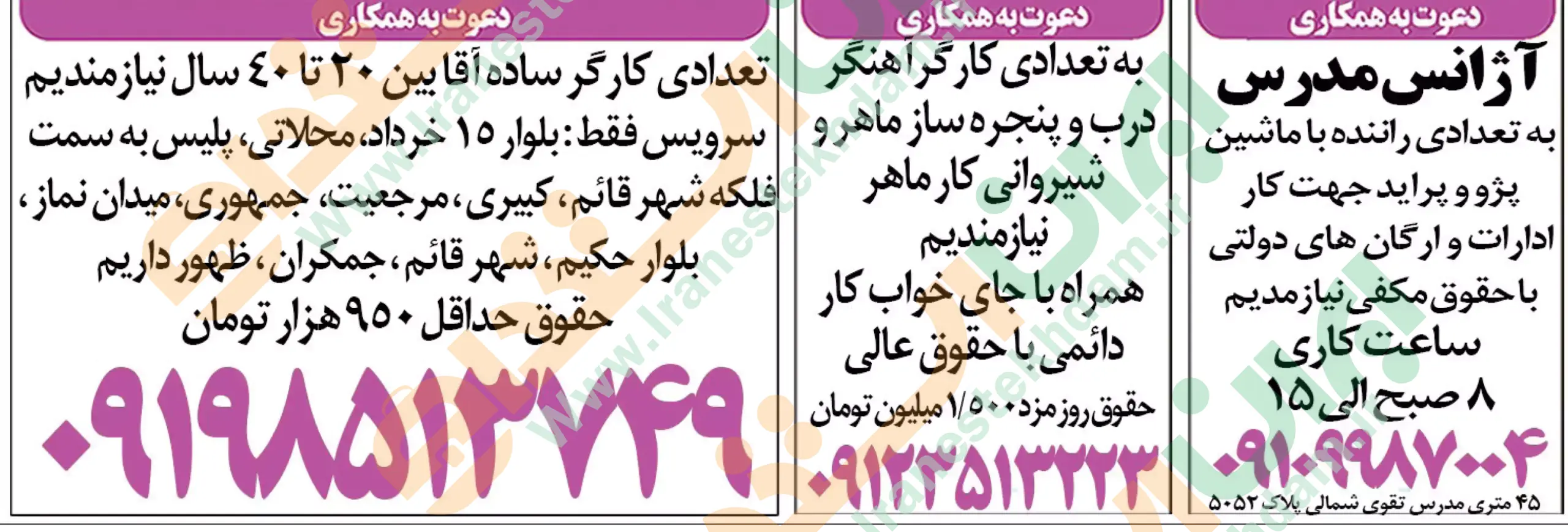 ♦ در صورتی که به دنبال موقعیت های شغلی روز قم هستید، میتوانید از طریق سایت ایران استخدام از یکی از روش های دریافت آگهی های استخدامی “از طریق ایمیل و پیامک – از طریق اپلیکیشن اختصاصی ایران استخدام – از طریق کانال تلگرام ایران استخدام” اقدام نمایید.