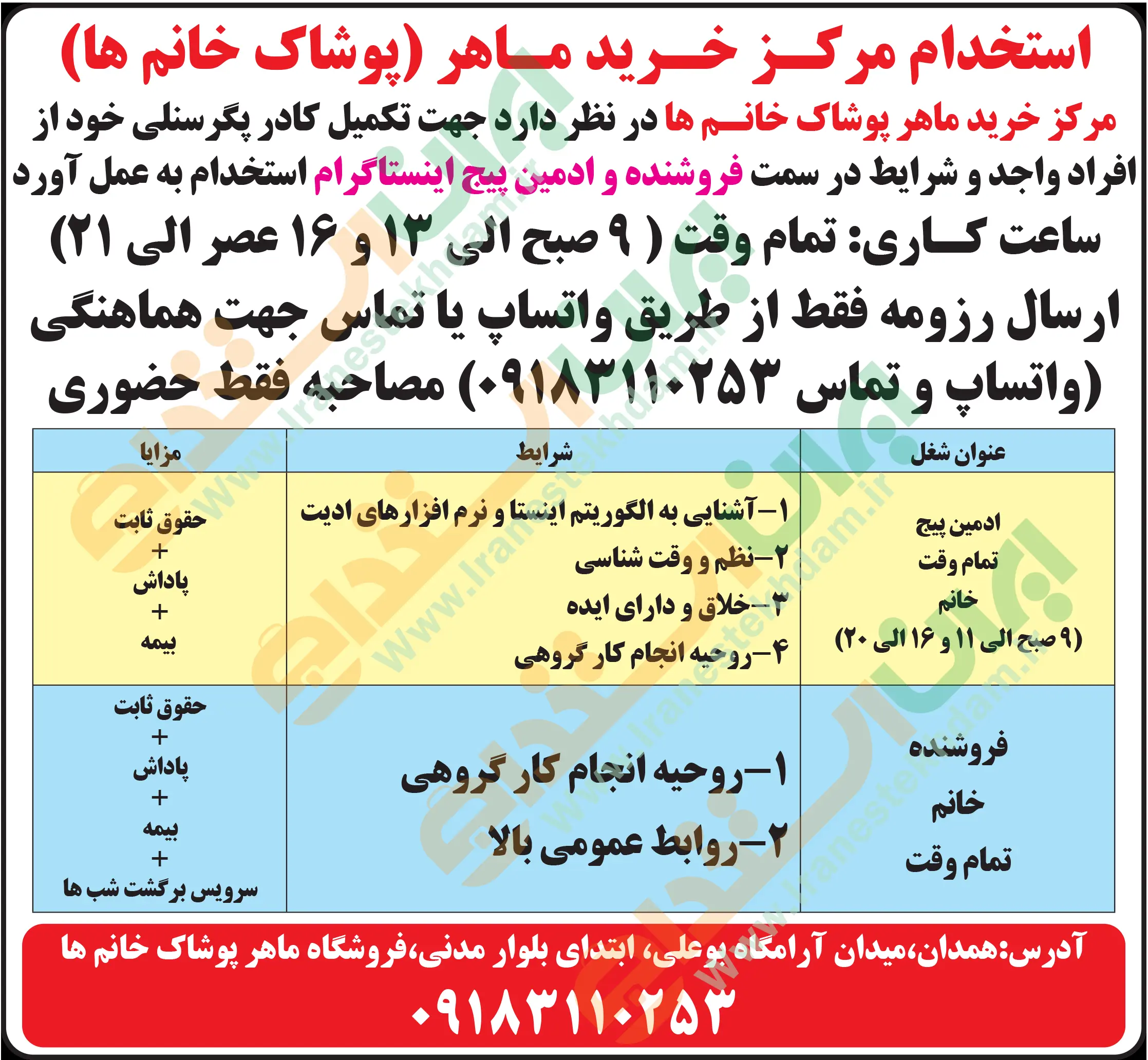 ♦ در صورتی که به دنبال موقعیت های شغلی روز همدان هستید، میتوانید از طریق سایت ایران استخدام از یکی از روش های دریافت آگهی های استخدامی “از طریق ایمیل و پیامک – از طریق اپلیکیشن اختصاصی ایران استخدام – از طریق کانال تلگرام ایران استخدام” اقدام نمایید.