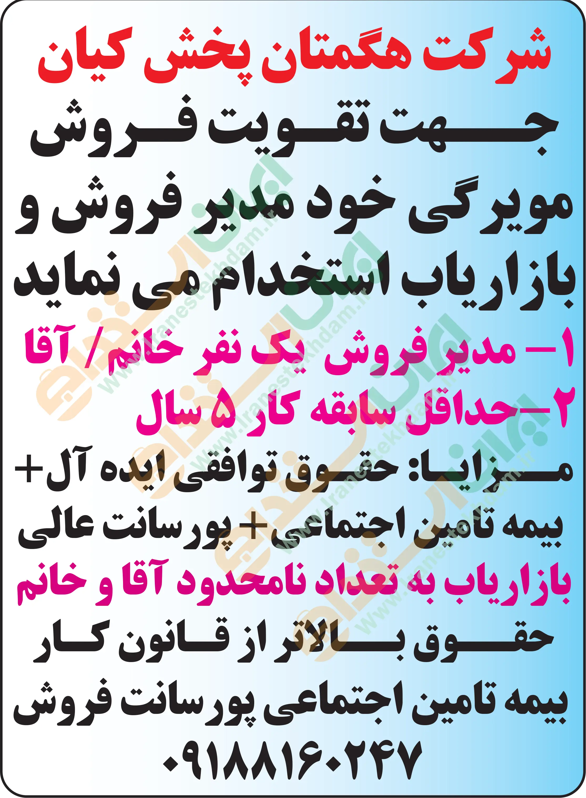 ♦ در صورتی که به دنبال موقعیت های شغلی روز همدان هستید، میتوانید از طریق سایت ایران استخدام از یکی از روش های دریافت آگهی های استخدامی “از طریق ایمیل و پیامک – از طریق اپلیکیشن اختصاصی ایران استخدام – از طریق کانال تلگرام ایران استخدام” اقدام نمایید.