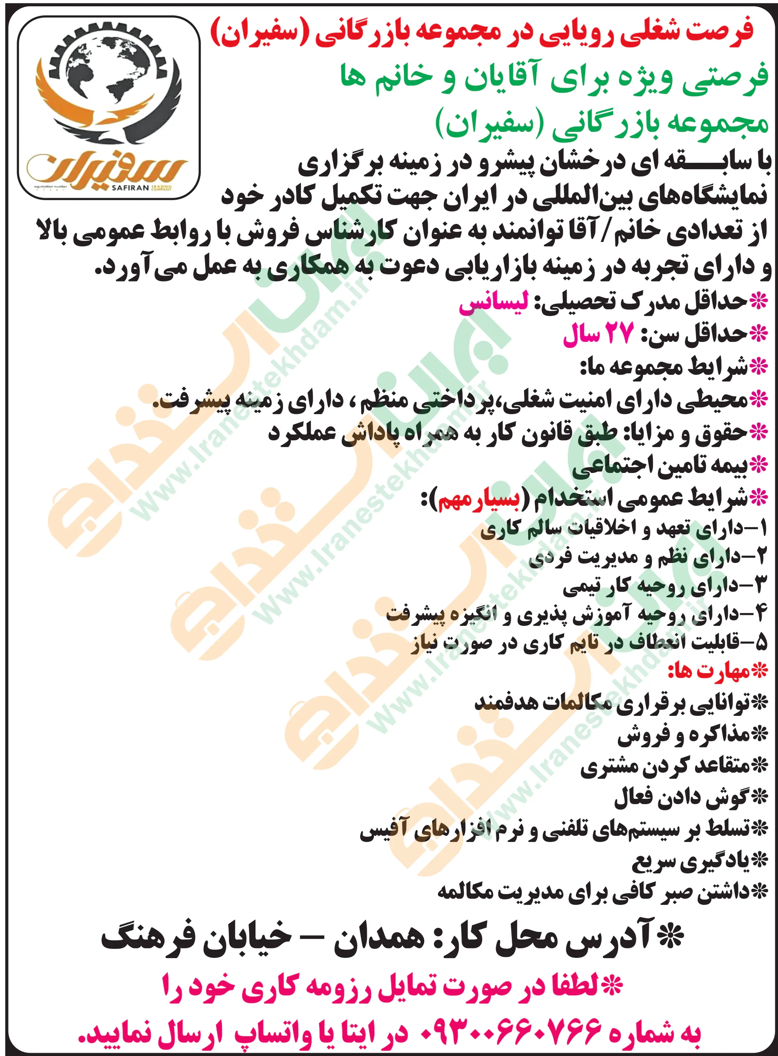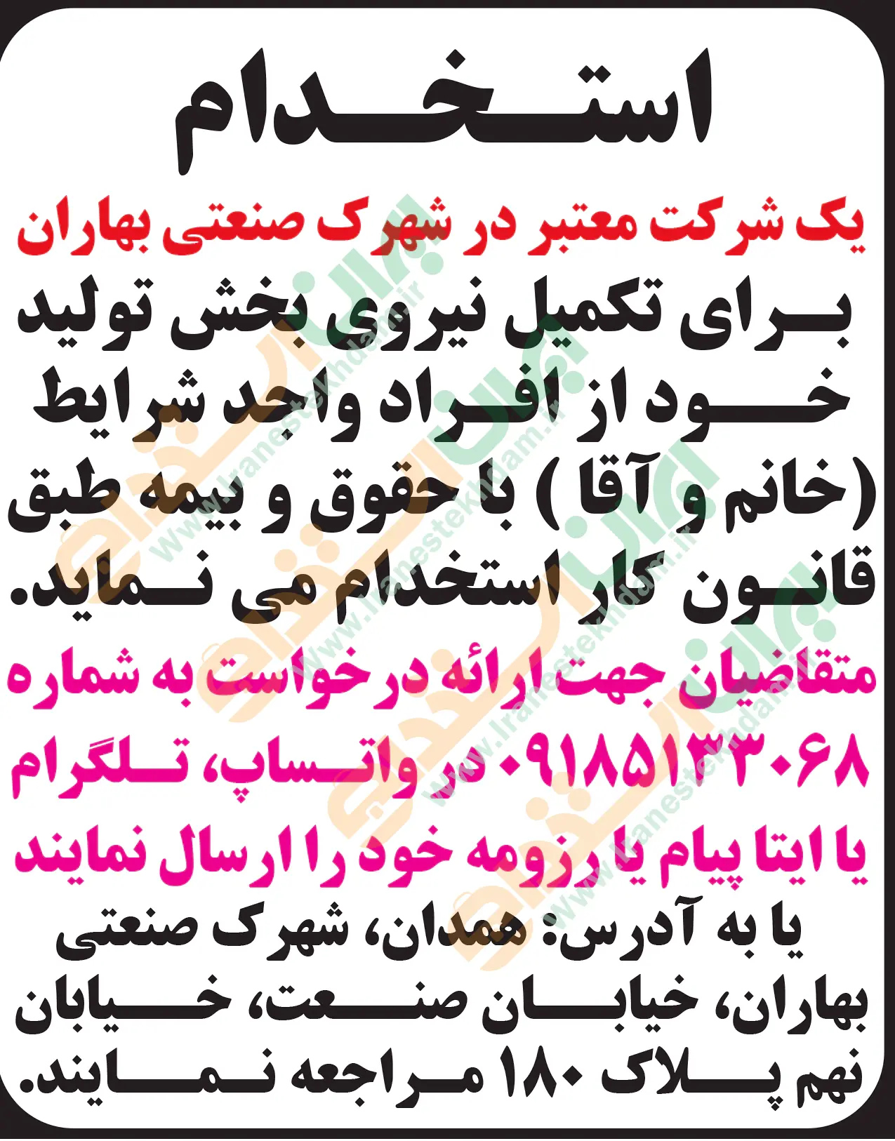 ♦ در صورتی که به دنبال موقعیت های شغلی روز همدان هستید، میتوانید از طریق سایت ایران استخدام از یکی از روش های دریافت آگهی های استخدامی “از طریق ایمیل و پیامک – از طریق اپلیکیشن اختصاصی ایران استخدام – از طریق کانال تلگرام ایران استخدام” اقدام نمایید.
