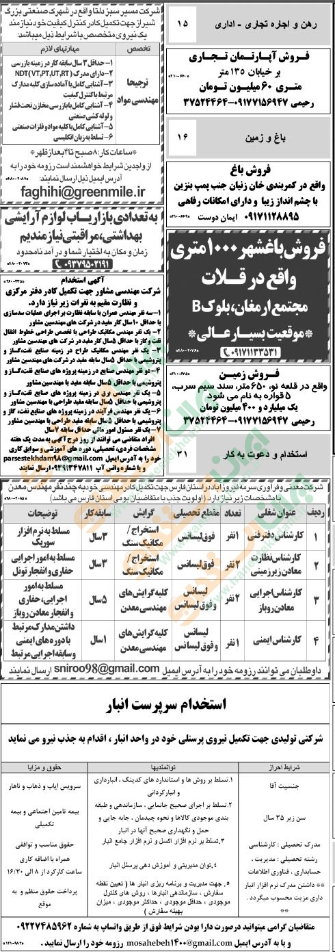 روزنامه استخدامی فارس و شهر شیراز | شنبه 30 بهمن 1400
