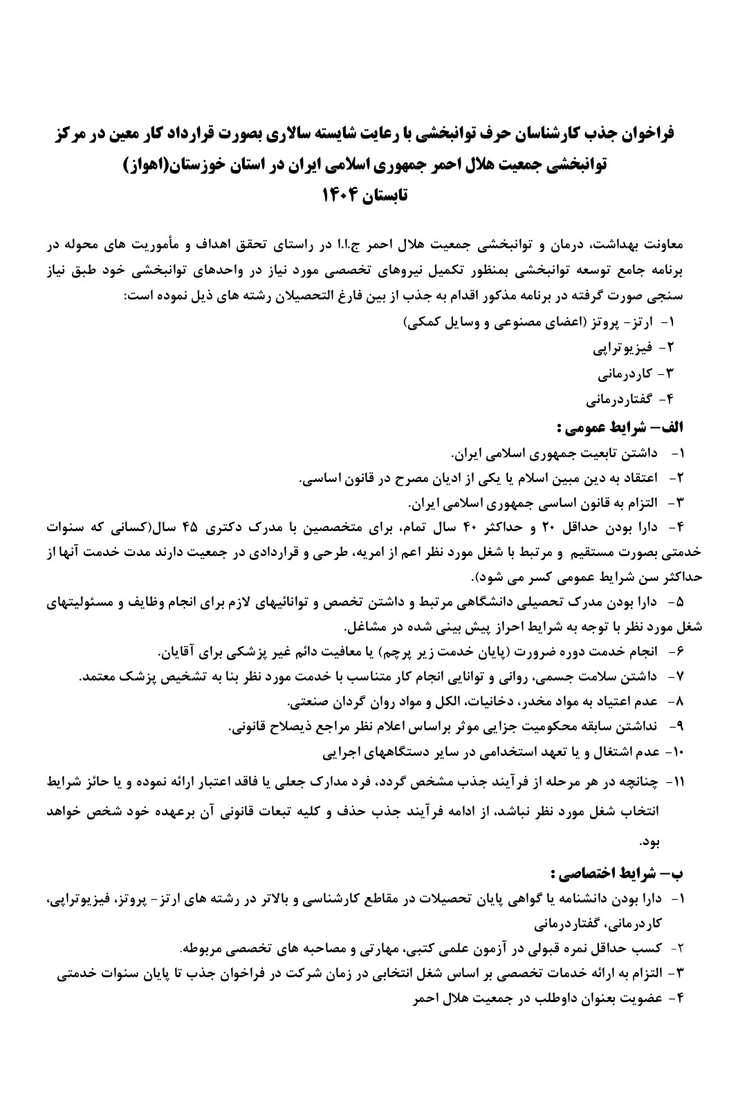 آگهی 26 مرداد 1404: جذب نیروهای تخصصی در اداره کل توانبخشی و مرکز جامع توانبخشی جمعیت هلالاحمر جمهوری اسلامی ایران