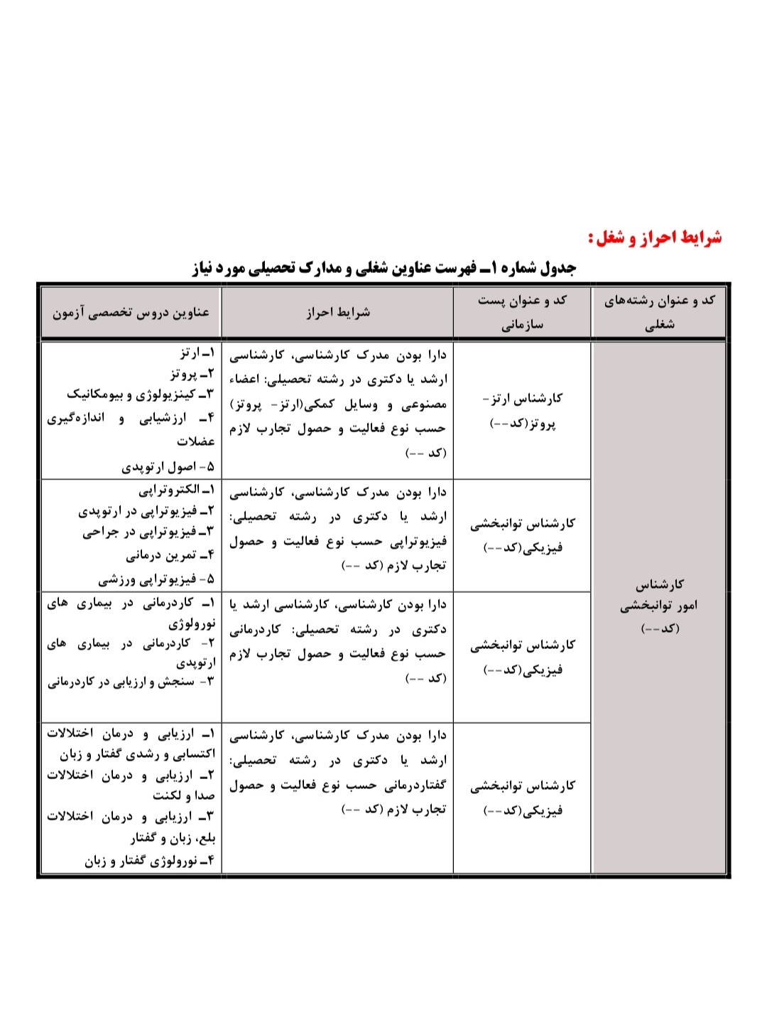معاونت بهداشت، درمان و توانبخشی جمعیت هالل احمر ج.ا.ا در راستای تحقق اهداف و مأموریت های محوله در برنامه جامع توسعه توانبخشی بمنظور تکمیل نیروهای تخصصی مورد نیاز در واحدهای توانبخشی خود طبق نیاز سنجی صورت گرفته در برنامه مذکور اقدام به جذب از بین فارغ التحصیالن رشته های ذیل نموده است.