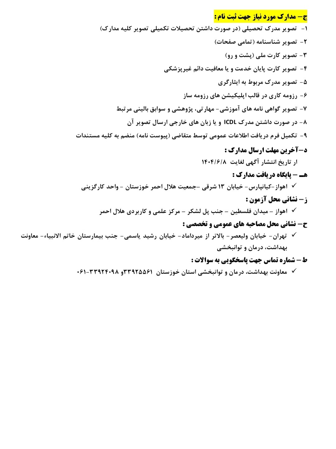 تذکر: متقاضیانی مجاز به شرکت در آزمون میباشند که بومی استان باشند. (تأیید بومی بودن شرکت کنندگان بر اساس احراز محل سکونت و گزینش محلی از سوی مراجع ذیربط جمعیت استان و نمایندگان اعزامی معاونت درمان انجام می پذیرد)