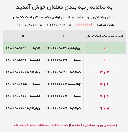 وی همچنین اعلام کرد که به منظور حفظ عدالت در ورود اطلاعات و جلوگیری از افزایش بیش از حد بار سامانه، اینگونه برنامه ریزی کردهایم که هر رقم کدملی از سمت راست (اولین رقم سمت راست کد ملی) ۲.۵ روز کاری برای ثبت نام فرصت داشته باشد و امروز از صفر شروع میشود تا به کد ۹ برسیم. جدول زمانبندی مشخص شده است. با این حال پس از اتمام این زمان نیز فرصت دوباره ای به همه همکاران که موفق به ثبت نام نشدهاند داده میشود و جای استرس و نگرانی نیست.