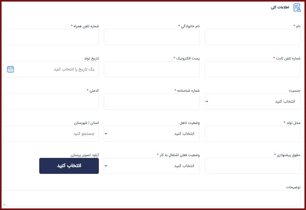 در این بخش، پس از کلیک بر روی گزینه فرم استخدام، اطلاعات کلی شامل نام و نام خانوادگی، شماره تماس، شماره شناسنامه، محل تولد و… را تکمیل نمایید. همچنین در پایان بخش اطلاعات کلی، عکس پرسنلی خود را آپلود کنید.