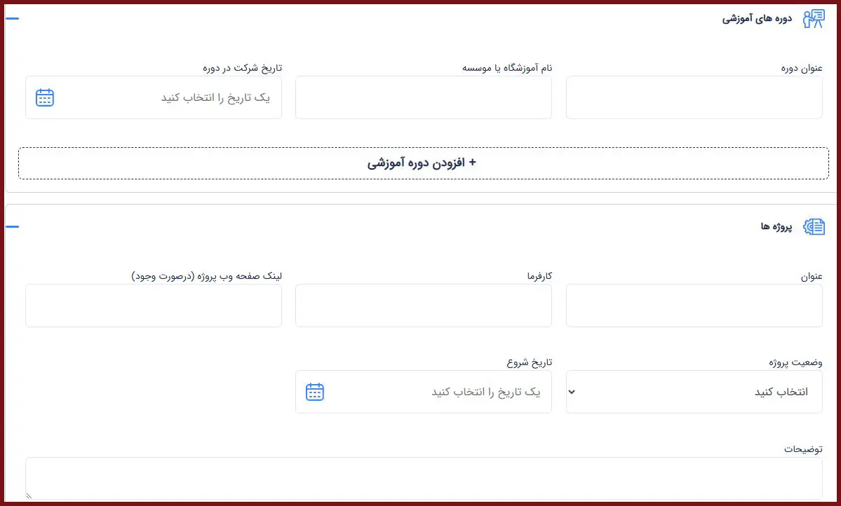 در این بخش، در صورت گذراندن دورههای آموزشی و داشتن پروژهها، اطلاعات مربوطه را وارد نمایید.