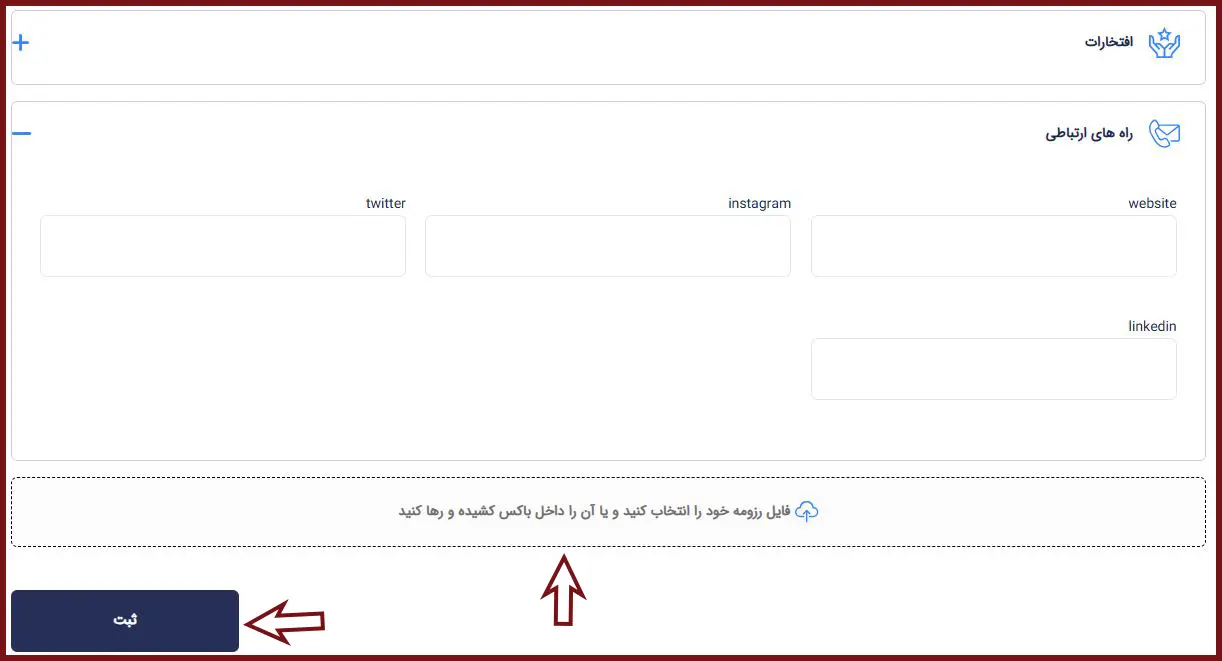 در این مرحله، در صورت داشتن افتخارات و راههای ارتباطی، اطلاعات مربوطه را تکمیل کرده و سپس فایل رزومه خود را در کادر مشخصشده آپلود نمایید. در پایان، بر روی گزینه «ثبت» کلیک کنید.