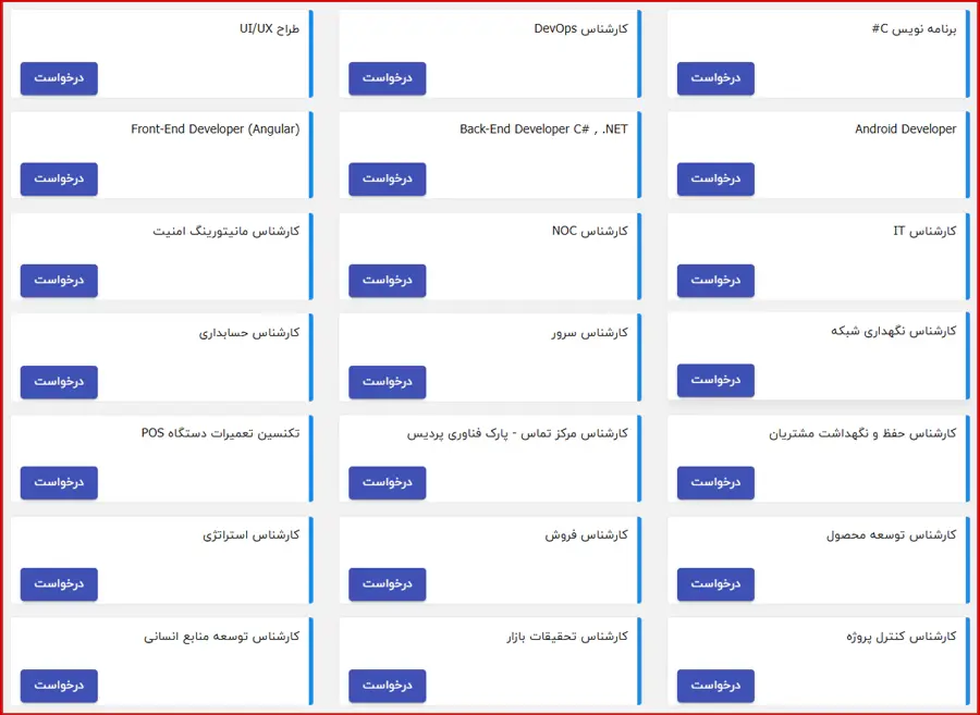 پس از کلیک روی گزینه فرصتهای شغلی، فهرستی از موقعیتهای شغلی فعال این شرکت نمایش داده میشود که می توانید شغل موردنظر خود را انتخاب کرده و روی گزینه "درخواست" کلیک نمایید.