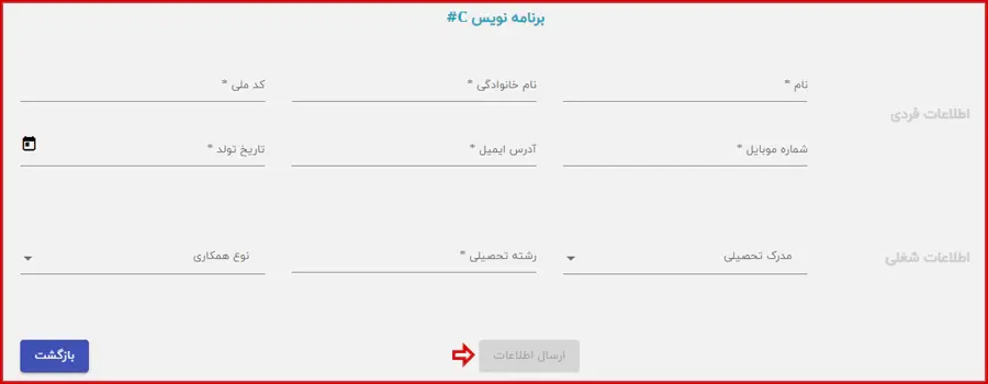 در این مرحله، لازم است اطلاعات فردی و شغلی خود شامل نام و نام خانوادگی، کد ملی،مدرک و رشته تحصیلی و.. را وارد کرده و روی دکمه "ارسال اطلاعات" کلیک نمایید.