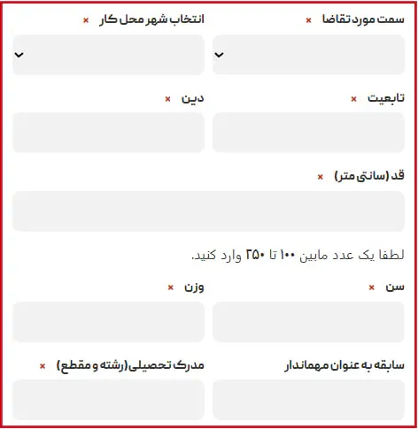 در این بخش، اطلاعاتی نظیر سمت موردتقاضا، شهر محل کار، تابعیت و.. را وارد نمایید.