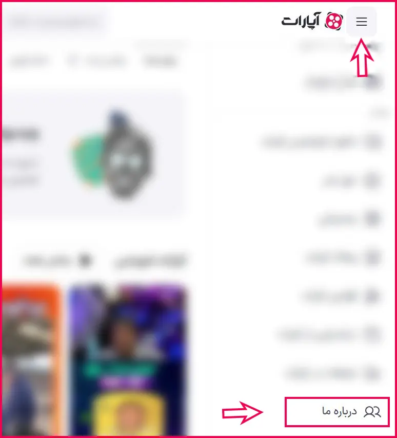 پس از ورود به صفحه اصلی آپارات، در قسمت بالای صفحه، سمت راست، روی گزینه سهخط (منوی اصلی) را انتخاب کنید. سپس از قسمت پایین منو بر روی گزینه «درباره ما» کلیک نمایید.