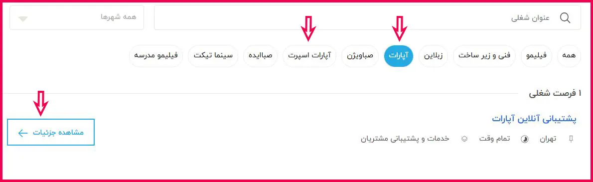 با انتخاب گزینه «مشاهده فرصتهای شغلی»، فهرست مشاغل فعال نمایش داده میشود. در این بخش، از فیلترهای بالای آگهیها، گزینه «آپارات» را انتخاب نمایید تا موقعیتهای شغلی مربوط به آپارات نمایش داده شود. پس از بررسی عناوین شغلی، موقعیت موردنظر خود را انتخاب کرده و برای مشاهده توضیحات و شرایط استخدام، بر روی گزینه «مشاهده جزئیات» کلیک کنید.