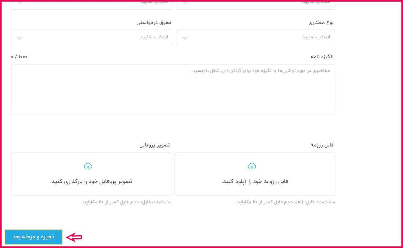 پس از انتخاب گزینه «ارسال درخواست»، وارد صفحه فرم استخدام میشوید. در این مرحله اطلاعات فردی موردنیاز را تکمیل کرده و در بخش پایانی، فایل رزومه و تصویر پروفایل خود را بارگذاری نمایید. سپس بر روی گزینه «ذخیره و مرحله بعد» کلیک کنید.
