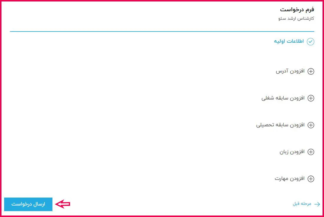در این مرحله، اطلاعات مربوط به محل سکونت، سوابق شغلی، سوابق تحصیلی، زبانهای خارجی و مهارتها را وارد کرده و در نهایت بر روی گزینه «ارسال درخواست» کلیک نمایید.