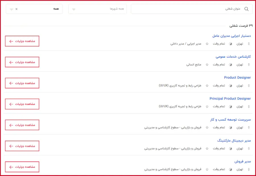 در این مرحله، فهرستی از فرصتهای شغلی فعال این شرکت نمایش داده میشود که میتوانید براساس دو فیلد عنوان شغلی و شهر موردنظر، شغل خود را انتخاب کرده و روی دکمه "مشاهده جزئیات" کلیک نمایید.