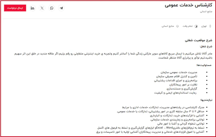 استخدام شرکت اکالا شرکت اُکالا در تهران جهت تکمیل کادر خود از واجدین شرایط زیر دعوت به همکاری می نماید: عنوان شغلی شرایط احراز کارشناس خدمات عمومی سن: از 25 سال تا 35 سال روزهای کار: شنبه تا چهارشنبه جنسیت: آقا مدیریت خدمات عمومی سازمان تأمین و کنترل اقلام مصرفی سازمان برنامهریزی و اجرای اقدامات پشتیبانی نظارت بر امور پیمانکاران گزارشگیری و مستندسازی رعایت استانداردهای ایمنی و کیفیت مدرک کارشناسی در رشتههای مدیریت، تدارکات، خدمات اداری یا مرتبط حداقل 2 تا 3 سال سابقه کاری در امور پشت...