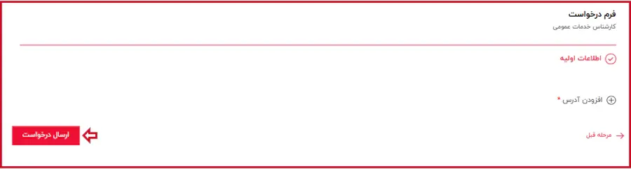 در این مرحله، روی گزینه "افزودن آدرس" کلیک کرده و اطلاعات خواسته شده را وارد کرده و روی دکمه "ارسال درخواست" کلیک نمایید.