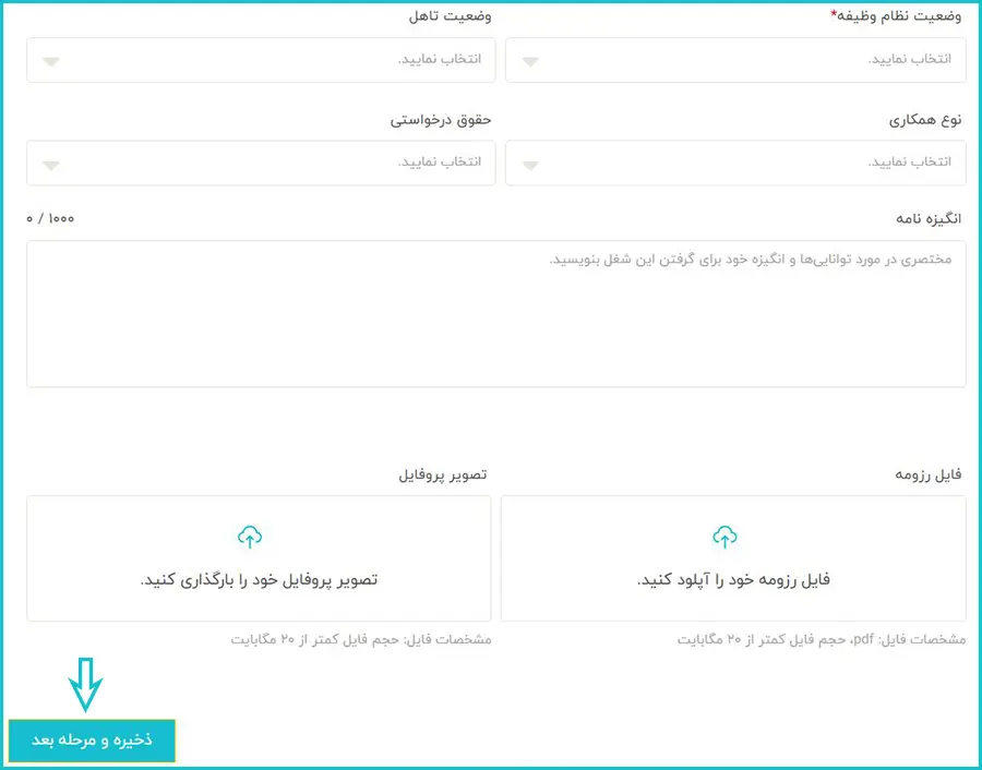 پس از کلیک بر روی دکمه ارسال درخواست، وارد صفحه فرم استخدام خواهید شد. در این مرحله لازم است مشخصات هویتی شامل نام و نام خانوادگی، شماره تماس، آدرس ایمیل، تاریخ تولد و سایر موارد خواستهشده را تکمیل نمایید. در بخش پایانی این صفحه، فایل رزومه و تصویر پروفایل خود را بارگذاری کرده و سپس بر روی دکمه «ذخیره و مرحله» کلیک کنید.