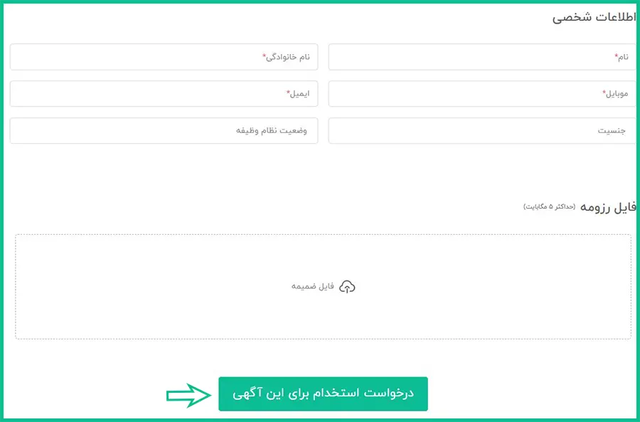 در این مرحله، اطلاعات شخصی مورد نیاز شامل نام و نام خانوادگی، شماره تماس، ایمیل، جنسیت و وضعیت نظام وظیفه را تکمیل نموده، سپس فایل رزومه خود را بارگذاری کرده و در پایان بر روی گزینه «درخواست استخدام برای این آگهی» کلیک نمایید.