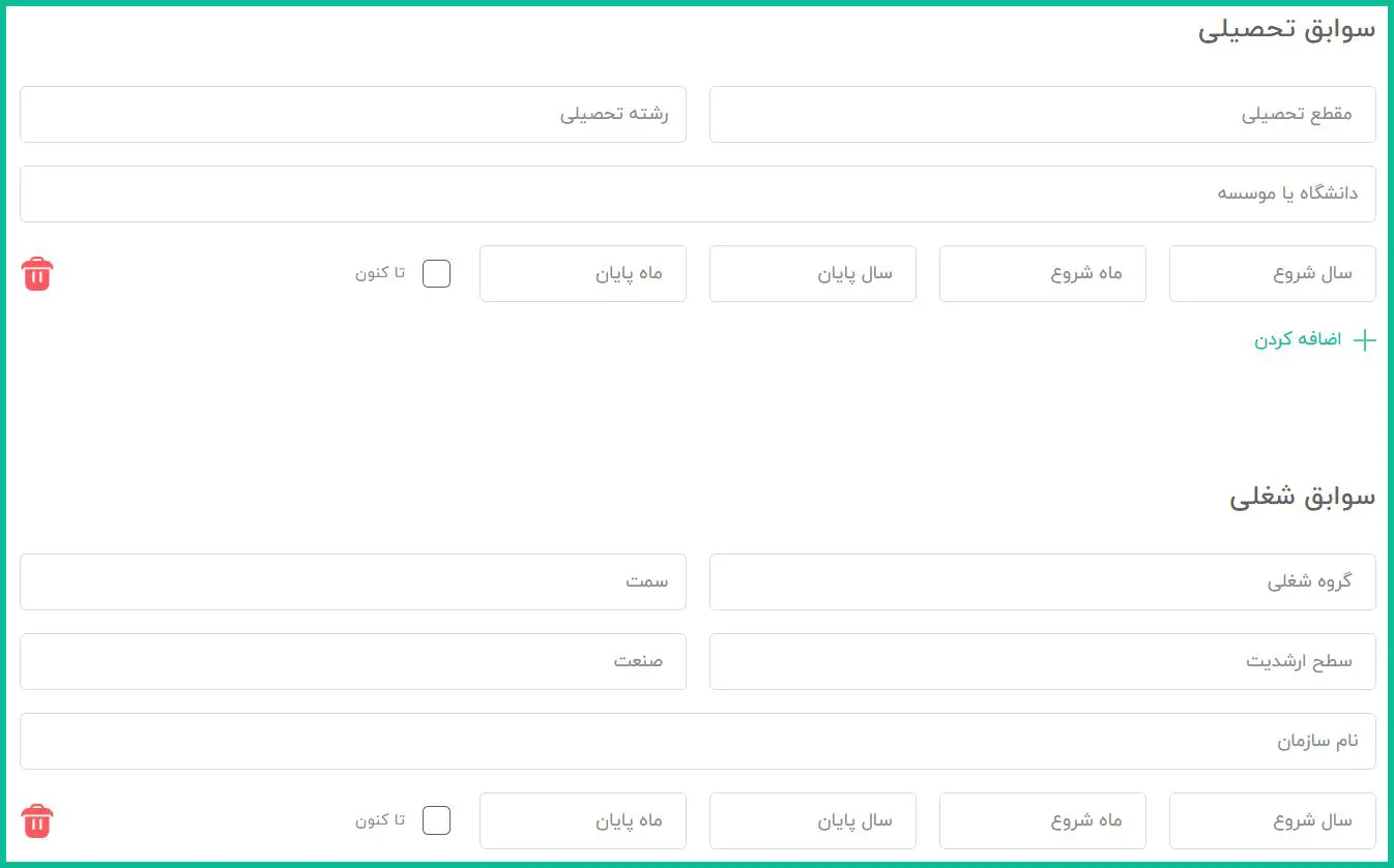 در این مرحله لازم است اطلاعات سوابق تحصیلی و سوابق شغلی خود را بهطور کامل تکمیل نمایید.