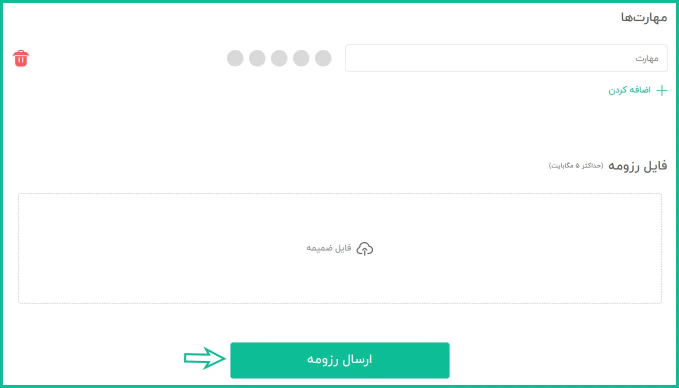 پس از تکمیل مراحل قبل، در این بخش مهارتهای تخصصی خود را وارد کرده و سپس فایل رزومه را در کادر مشخصشده بارگذاری نمایید.