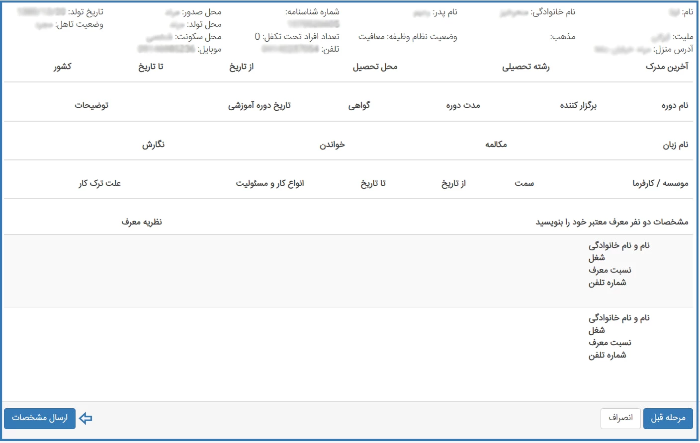 در این مرحله، تمام اطلاعات وارد شده نمایش داده میشود پس از بررسی و اطمینان از صحت آنها، روی دکمه "ارسال مشخصات" کلیک نمایید.