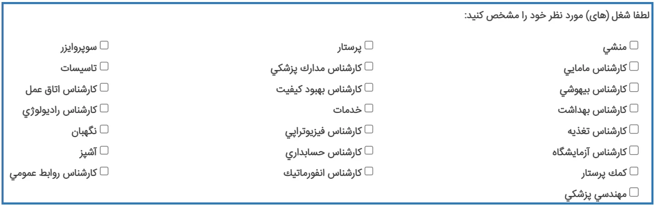 پس از کلیک روی گزینه دعوت به همکاری، فهرستی از فرصتهای شغلی نمایش داده میشود که باید با توجه به تخصص و توانمندیهای خود، یک یا چند شغل موردنظر را انتخاب نمایید.