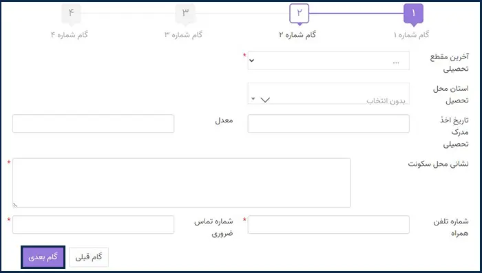 پس از کلیک بر روی گزینه «بعدی»، وارد مرحله دوم تکمیل فرم میشوید. در این مرحله، اطلاعات تحصیلی خود را تکمیل کرده و سپس بر روی گزینه «گام بعدی» کلیک نمایید.