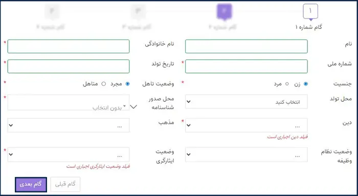 پس از ورود به صفحه مربوطه، اطلاعات و مشخصات خواستهشده را بهصورت کامل تکمیل کرده و در پایان، بر روی گزینه «گام بعدی» کلیک نمایید.
