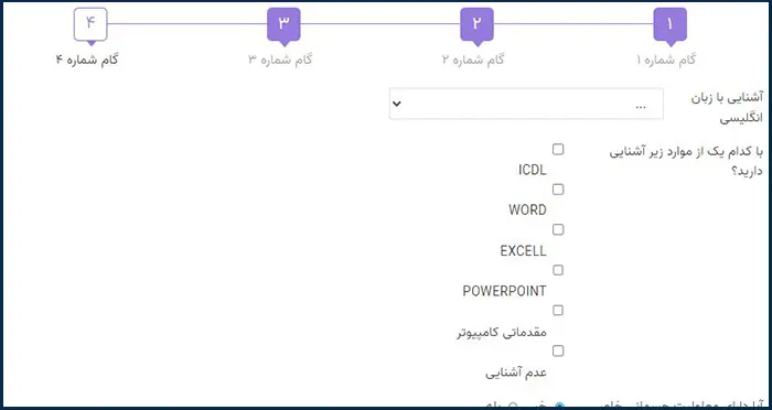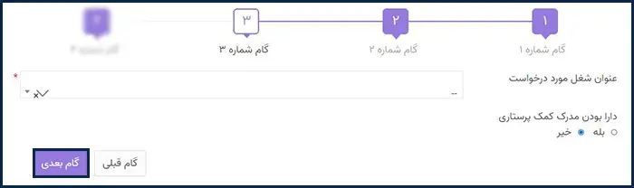 پس از کلیک بر روی گزینه «بعدی»، وارد مرحله سوم تکمیل فرم میشوید. در این مرحله، عنوان شغلی مورد نظر خود را انتخاب کرده و سپس بر روی گزینه «گام بعدی» کلیک نمایید.