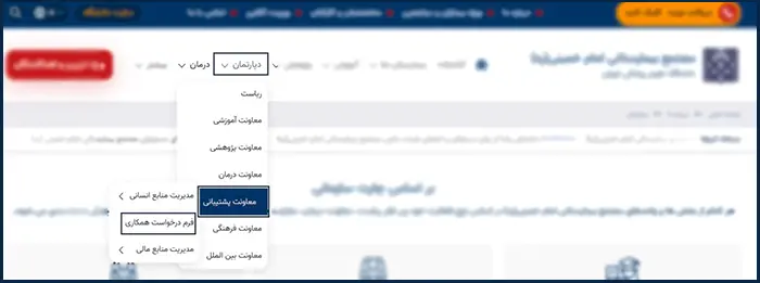 از سربرگ بالای سایت، گزینه «دپارتمان» را انتخاب کرده و سپس گزینه «معاونت پشتیبانی» را انتخاب کرده و برروی گزینه «فرم درخواست همکاری» کلیک نمایید.