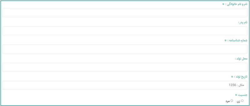 پس از کلیک روی گزینه همکاری با ما، صفحهای مشابه تصویر زیر در قالب فرم استخدام نمایش داده می شود که در آن باید اطلاعات هویتی خود مانند نام و نام خانوادگی، نام پدر، شماره شناسنامه و.. را وارد نمایید.