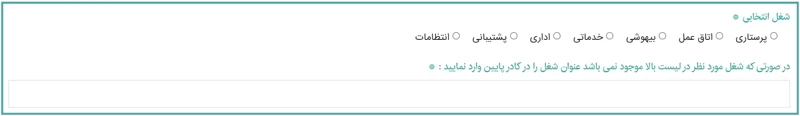 در این بخش از فرم، باید عنوان شغلی مورد نظر خود را از میان گزینههای موجود انتخاب نمایید. در صورتی که شغل مدنظر شما در لیست بالا وجود نداشته باشد، میتوانید عنوان دقیق آن را در کادر مشخصشده وارد نمایید.