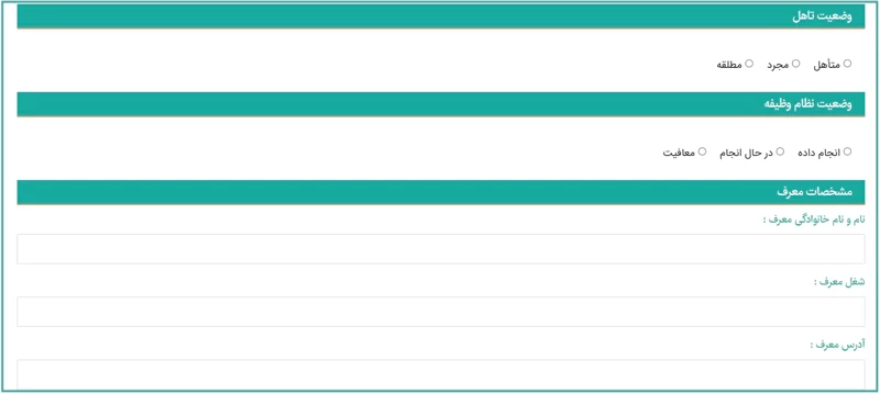 در این مرحله میتوانید وضعیت تأهل خود را از میان گزینههای موجود مشخص کنید. همچنین، آقایان باید وضعیت خدمت نظام وظیفه خود را انتخاب نمایند. در ادامه، میتوانید اطلاعات معرف شامل نام و نام خانوادگی، شغل و آدرس را در کادرهای مربوطه وارد کنید.