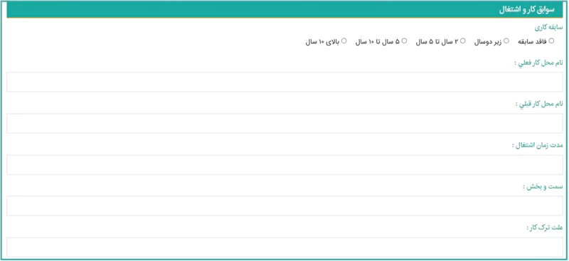 این مرحله مربوط به سوابق کاری شما است. ابتدا میتوانید میزان سابقه کاری خود را از میان گزینههای موجود انتخاب نمایید. در صورت تمایل، میتوانید اطلاعات شغلی شامل نام محل کار فعلی و قبلی، مدت زمان اشتغال و.. را در کادرهای مشخصشده وارد نمایید.