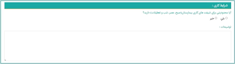 در این مرحله، باید مشخص کنید که آیا برای انجام شیفتهای مختلف کاری در بیمارستان محدودیتی دارید یا خیر. در صورت وجود هرگونه محدودیت یا شرایط خاص، میتوانید جزئیات مربوطه را در بخش توضیحات وارد نمایید.