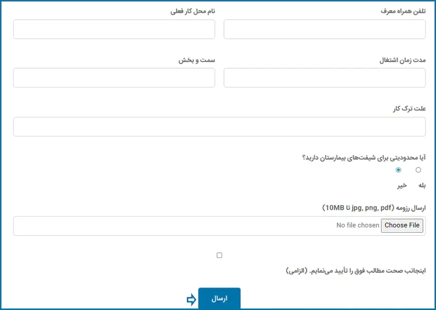 در این بخش اطلاعات شغلی خود مانند نام محل کار فعلی، مدت زمان اشتغال، سمت و بخش و علت ترک کار را وارد کنید، سپس محدودیت مربوط به شیفتهای بیمارستان را مشخص نمایید. در ادامه، در صورت داشتن رزومه آن را بارگذاری کرده و در پایان با تأیید صحت اطلاعات، روی دکمه "ارسال" کلیک نمایید.