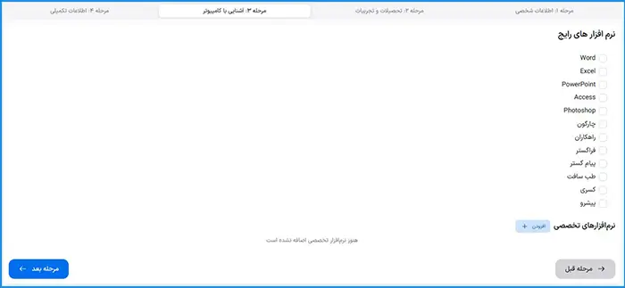 پس از تکمیل بخش تحصیلات و تجربیات، نرمافزارهایی که با آنها آشنایی دارید را انتخاب کرده و سپس بر روی گزینه «مرحله بعد» کلیک نمایید.