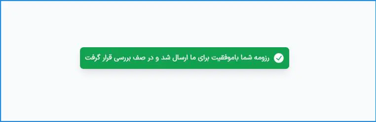 پس از تکمیل فرم استخدام و کلیک بر روی گزینه ارسال درخواست پیامی مطابق تصویر زیر دریافت خواهید کرد.