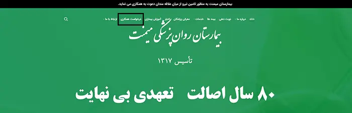 برای شروع فرآیند ثبت درخواست همکاری، ابتدا وارد صفحه اصلی بیمارستان میمنت شوید. (لینک مستقیم ورود به سایت اصلی در ادامه این صفحه قرار داده شده است.)