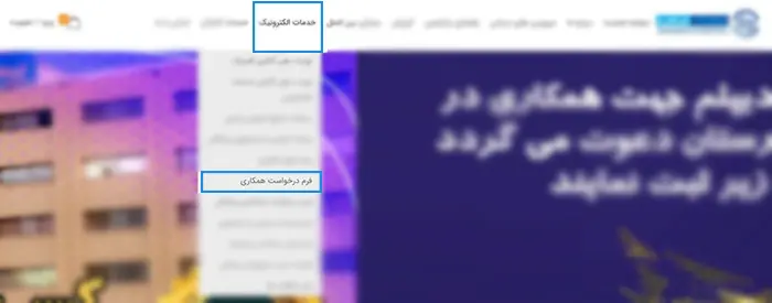پس از ورود به صفحه اصلی بیمارستان عسکریه، از منوی سربرگ سایت بخش «خدمات الکترونیک»، بر روی گزینه «فرم درخواست همکاری» کلیک نمایید.