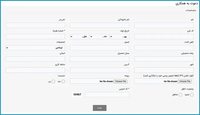 پس از ورود به صفحه مربوطه، اطلاعات خواستهشده را با دقت تکمیل کنید. در بخش پایانی فرم، بر روی گزینه «ثبت» کلیک نمایید.